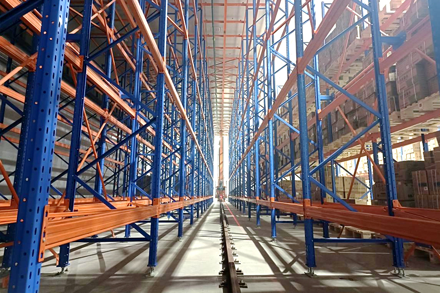 本方案總貨位29008個,長64m,寬11.2m,高14m。由貨架、天地軌、4臺直式巷道堆垛機系統、WMS、WCS系統等組成。貨架采用橫梁組合式,2個巷道8排25×6列24層+8排2列13層,堆垛機采用雙立柱地面支承形式。提高5倍以上倉儲空間面積。